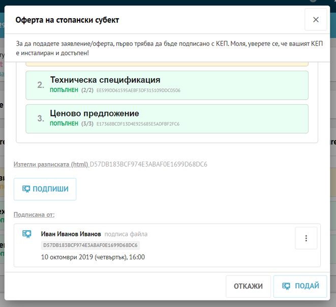Стъпка 2: Подаването на заявлението за участие/офертата се потвърждава чрез кликване върху бутон „Подпиши и подай“, след което системата активира подписването на конкретното заявление за участие/оферта чрез използването на КЕП.