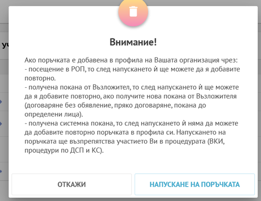 Потребител може да добави поръчка от покана за участие в ОП чрез кликване върху връзката или копирането ѝ в браузър.